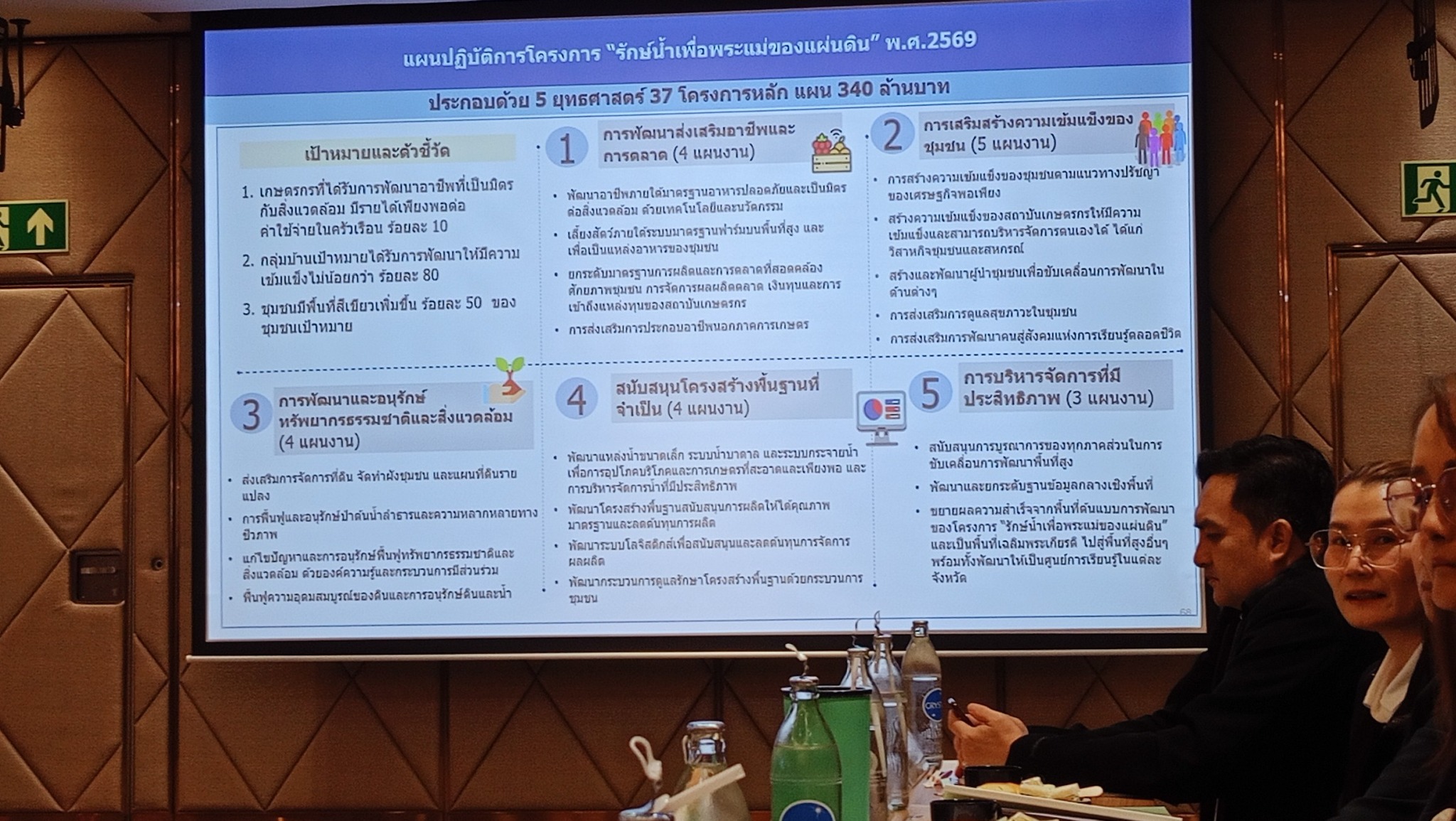 วันที่ 11 กันยายน 2568 อธิบดีมอบหมายร่วมประชุมคณะกรรมบริหารและกำกับดูแลโครงการ "รักน้ำเพื่อพระแม่ของแผ่นดิน" เป็นโครงการสนองพระราชดำริพระพันปีหลวง ของกระทรวงเกษตรและสหกรณ์ มีพื้นที่ดำเนินการคลอบคลุม 11 ลุ่มน้ำ 7 จังหวัด เชียงราย แม่ฮ่องสอน เชียงใหม่ น่าน อุตรดิตถ์ พิษณุโลก และเลย 129 หมู่บ้าน รับทราบผลงานปี 2568 หลายชุมชนเป็นชุมชนระดับ A พร้อมในการพัฒนา ขั้นสูงขึ้น เช่น ชุมชนบ่อหยวก ลุ่มน้ำคำ เชียงราย เป็นชุมชนลาหู่ (มูเซอ) เปลี่ยนพื้นที่ปลูกข้าวโพด หลายพันไร่ เป็นไร่ชาและกาแฟ เปลี่ยนระบบการผลิต จากไม่ยั่งยืนไปสู่ความยั่งยืนทุกด้าน เศรษฐกิจ สังคม สิ่งแวดล้อมสุขภาพ เต้ หนุ่มลาหู่ตัวแทนชุมชนบ่อหยวก เล่าว่า หลังจากเปลี่ยนมาปลูกชา กาแฟ พบว่า ปัญหา ดินสไลน์ น้ำป่าไหลหลากหลังฝนตกหนัก หายไปเลย ส่วนการเผาป่าทำไร่ข้าวโพดก็หมดไปเอง เพราะชาวบ้านมีรายได้จากไม้ยืนต้น ชา กาแฟ ส่งผลให้ดูเลพื้นที่ตนเองเป็นอย่างดี ความหวาดกลัวน้ำป่าไหลหลากดินถล่มของคนในหมู่บ้านหายไป สังคมมีความสุขมากขึ้น บางชุมชน เป็น B กำลังเรียนรู้ เริ่มมีอาชีพ C ยังไม่มีอาชีพ และ D มี2แห่งที่ยังไม่ได้เข้าไปช่วย การพัฒนา มีแผนงานเชิงยุทธศาสตร์ ระบุจุดเน้นการพัฒนาแต่ละหมู่บ้าน มีผู้รับผิดชอบหลัก มีเป้าหมายปัจจุบันที่เห็นอนาคต เน้นพัฒนาอาชีพ สร้างรายได้ อย่างยั่งยืน เน้นการพัฒนาผู้นำชุมชน และใช้ทรัพยากรจากพื้นที่เป็นฐานเศรษฐกิจ ยึดหลักปรัชญาของเศรษฐกิจพอเพียง สอดคล้องกับ VRIO Model ที่เป็นเครื่องมือที่กรมปศุสัตว์ใช้พัฒนาเกษตรกรรายย่อย